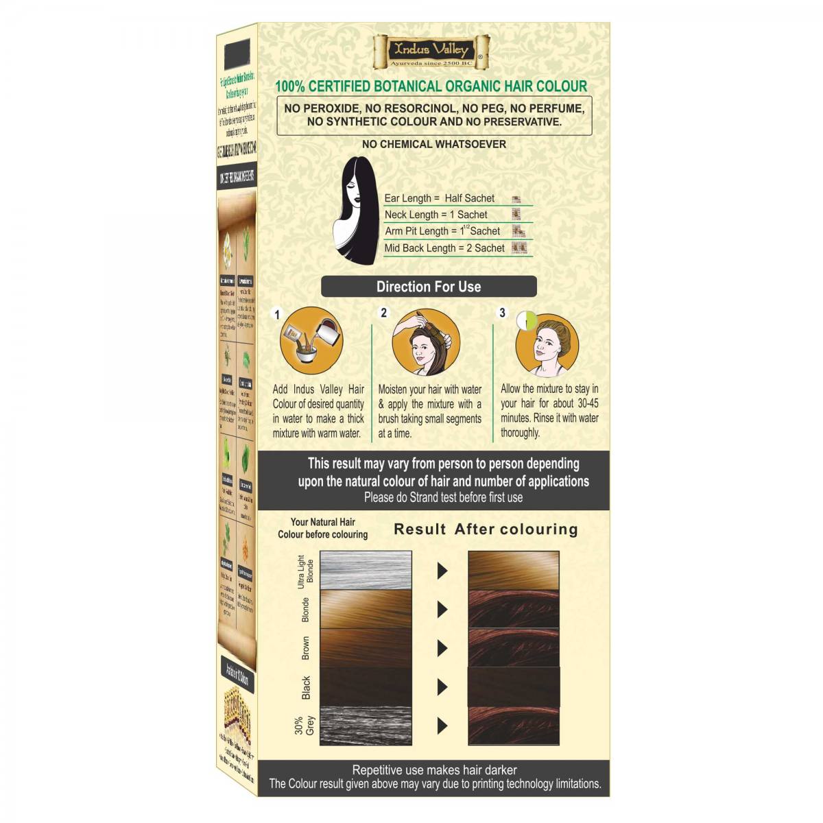 BARVA: mešanje teh ekoloških zelišč nam podajajo različne barvne odtenke od blond do rdeče, rjave vse do črne barve. Tak odtenk kot je naravna barva vaših lase, barva zbledi postopoma, opaznih ni nobenega belega oz. sivega narastka.