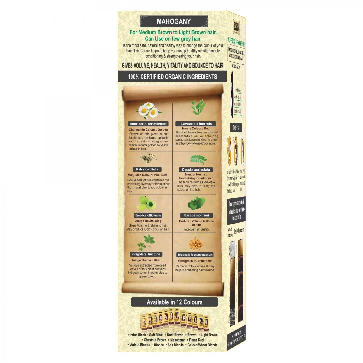 Sestava Certificirana ekološka kamilica, certificirana Manjistha (rubia cardifolia) - indijska rdeča barva, certificirani ekološki indigo listi, certificirana ekološka kana, certificirana ekološka sena, certificirana ekološka amla, certificirano ekološko grško seno, certificirani ekološki brahmi