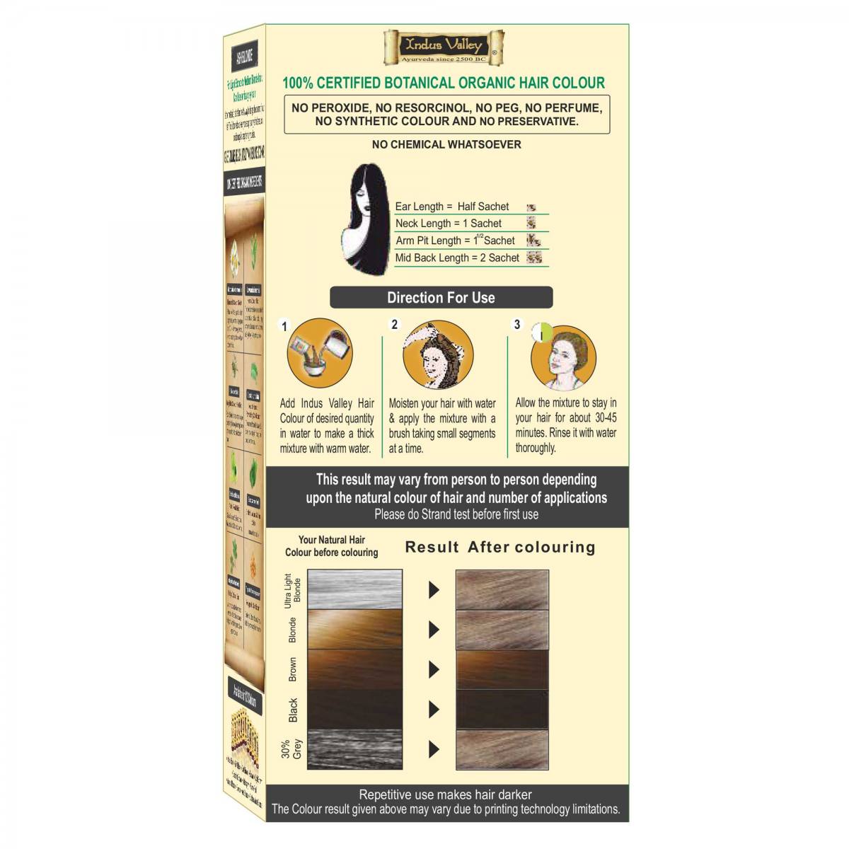 BARVA: mešanje teh ekoloških zelišč nam podajajo različne barvne odtenke od blond do rdeče, rjave vse do črne barve. Tak odtenk kot je naravna barva vaših lase, barva zbledi postopoma, opaznih ni nobenega belega oz. sivega narastka.