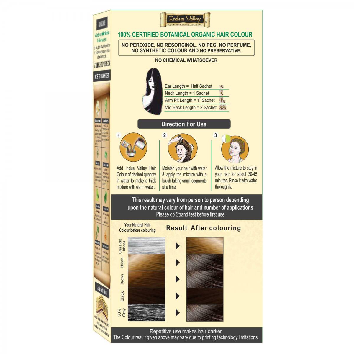 BARVA: mešanje teh ekoloških zelišč nam podajajo različne barvne odtenke od blond do rdeče, rjave vse do črne barve. Tak odtenk kot je naravna barva vaših lase, barva zbledi postopoma, opaznih ni nobenega belega oz. sivega narastka.