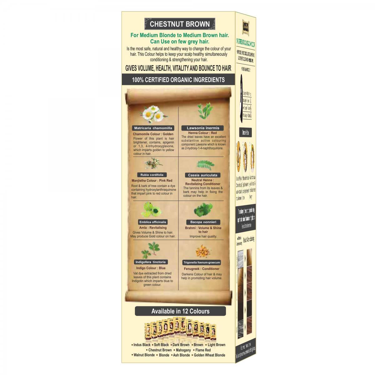Sestava Certificirana ekološka kamilica, certificirana Manjistha (rubia cardifolia) - indijska rdeča barva, certificirani ekološki indigo listi, certificirana ekološka kana, certificirana ekološka sena, certificirana ekološka amla, certificirano ekološko grško seno, certificirani ekološki brahmi